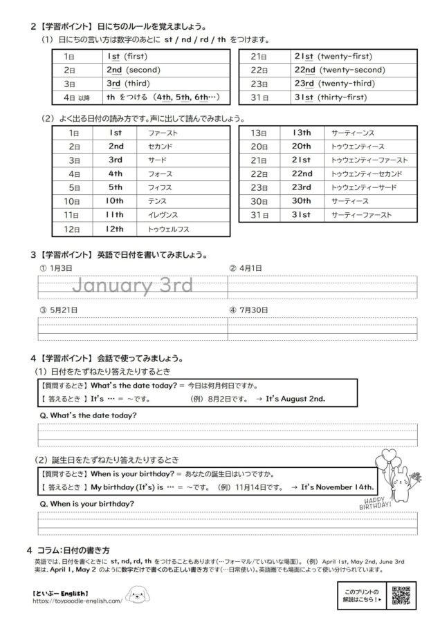📝 日にちを言うときは、数字のあとに st / nd / rd / th をつけるのが基本です。