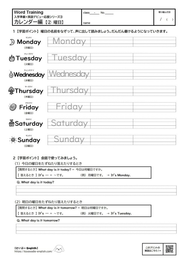 Contents はじめにプリントの内容① 月と日付をおぼえよう!🌙② 曜日をおぼえよう!&#…