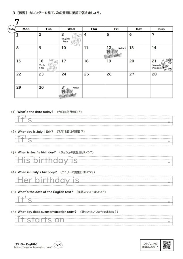 3 【練習】カレンダーを見て、次の質問に英語で答えましょう。