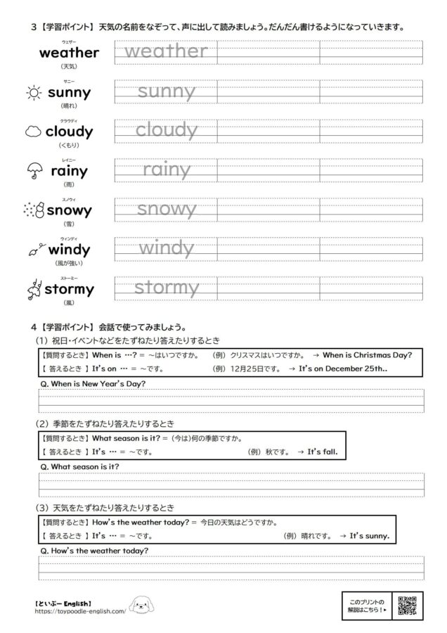 毎日、家族や先生と「What’s the date today?」「It’s sunny today!」と話してみましょう☀️