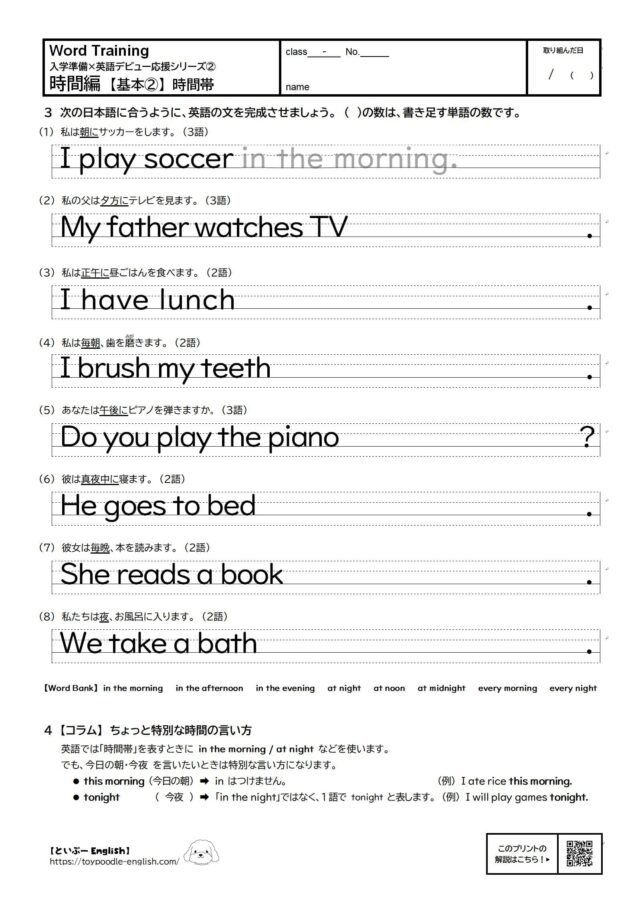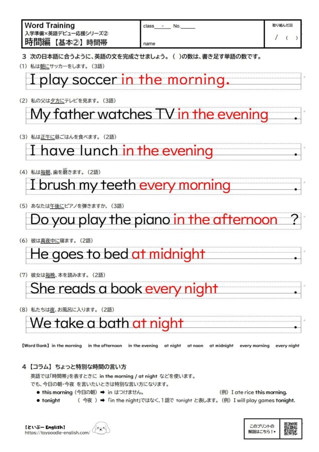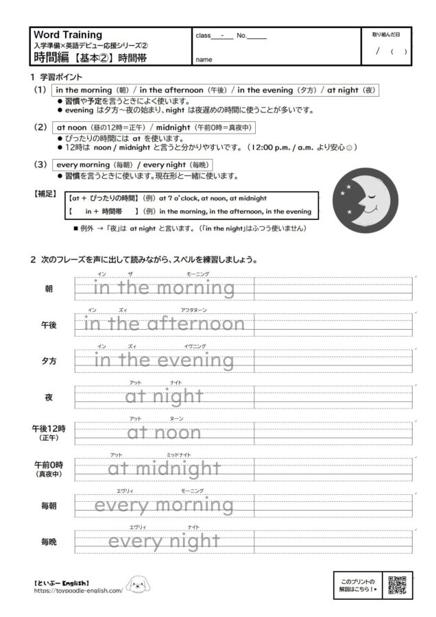 - 基本②|時間帯の表現 → in the morning / at night / every night など生活でよく使う言い方