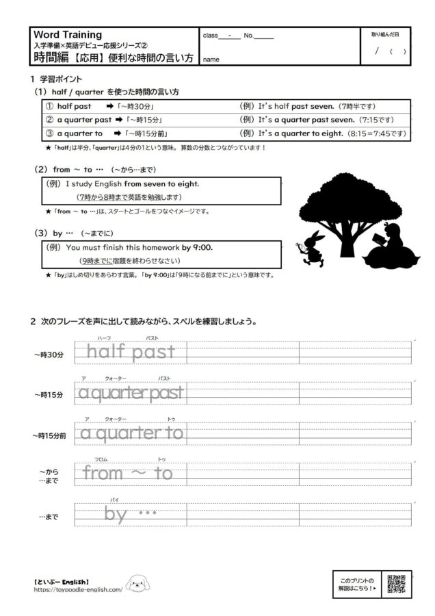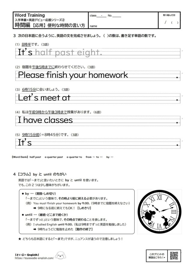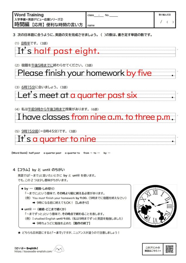 - 応用|便利な時間の言い方 → half past, quarter to, from〜to, by / until