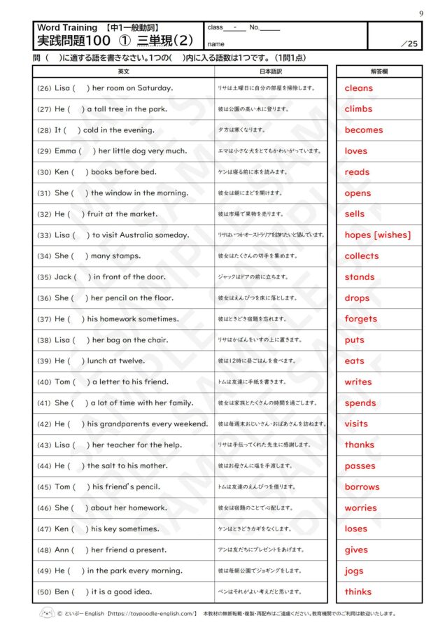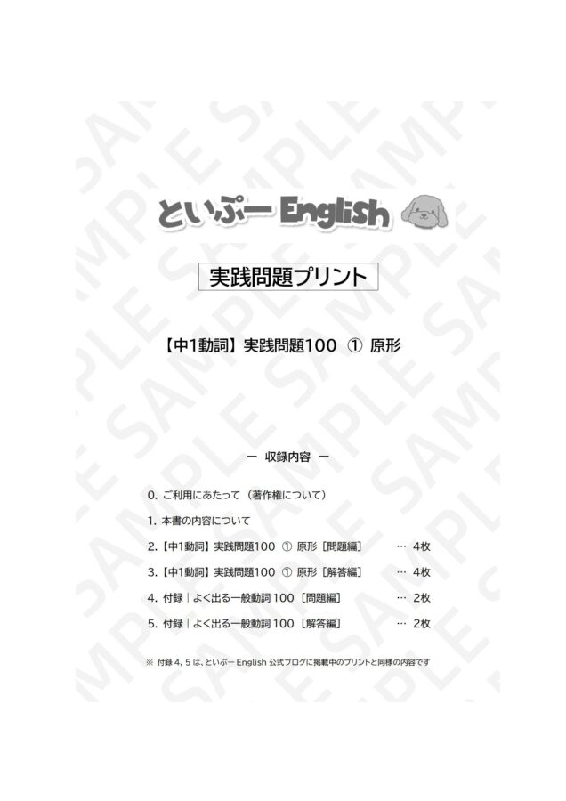 1枚ずつ取り組んでいけば、中1レベルの動詞はこれで完璧になります。