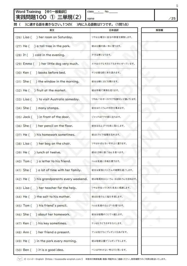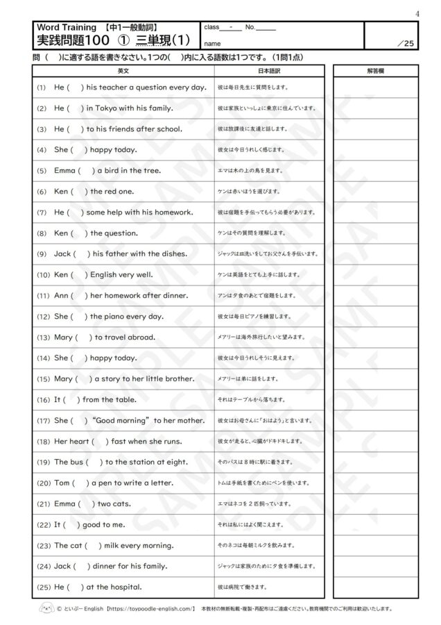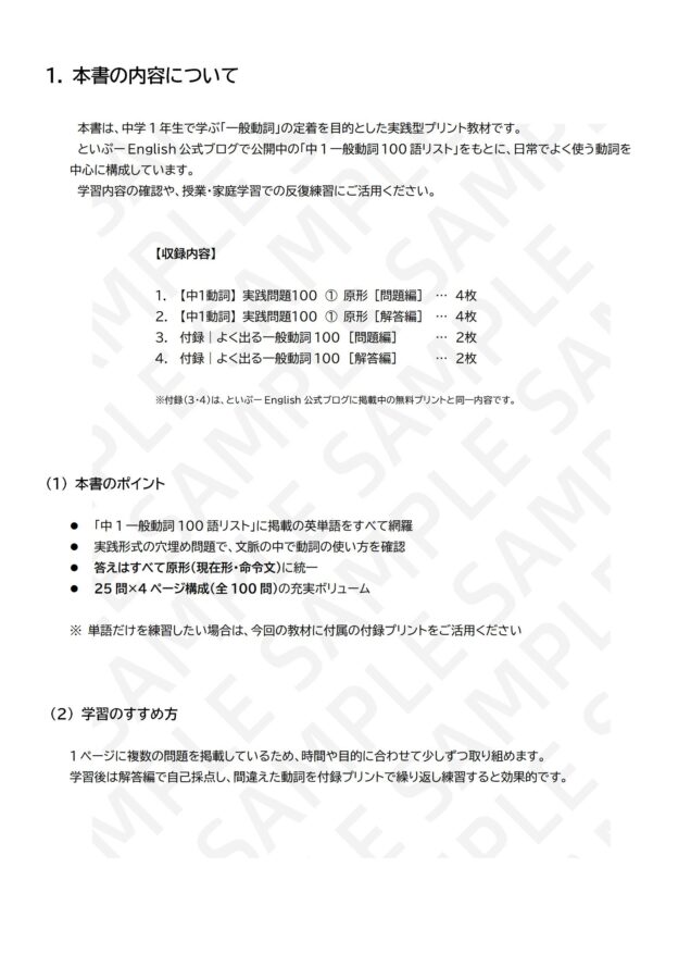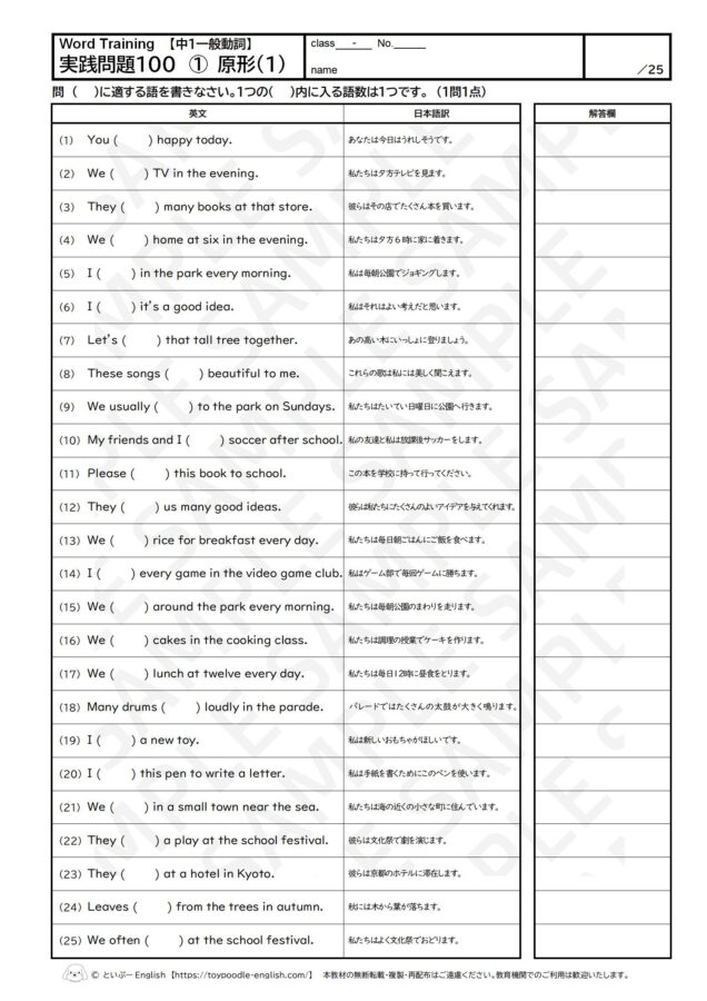 中学1年で習う一般動詞を、文の中で使えるように練習できる実践型プリント教材です。