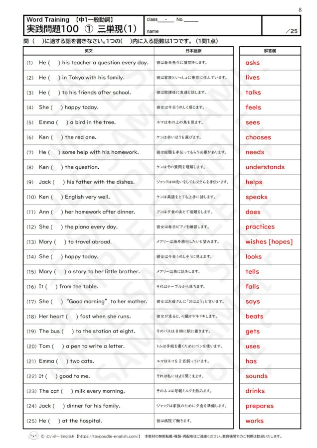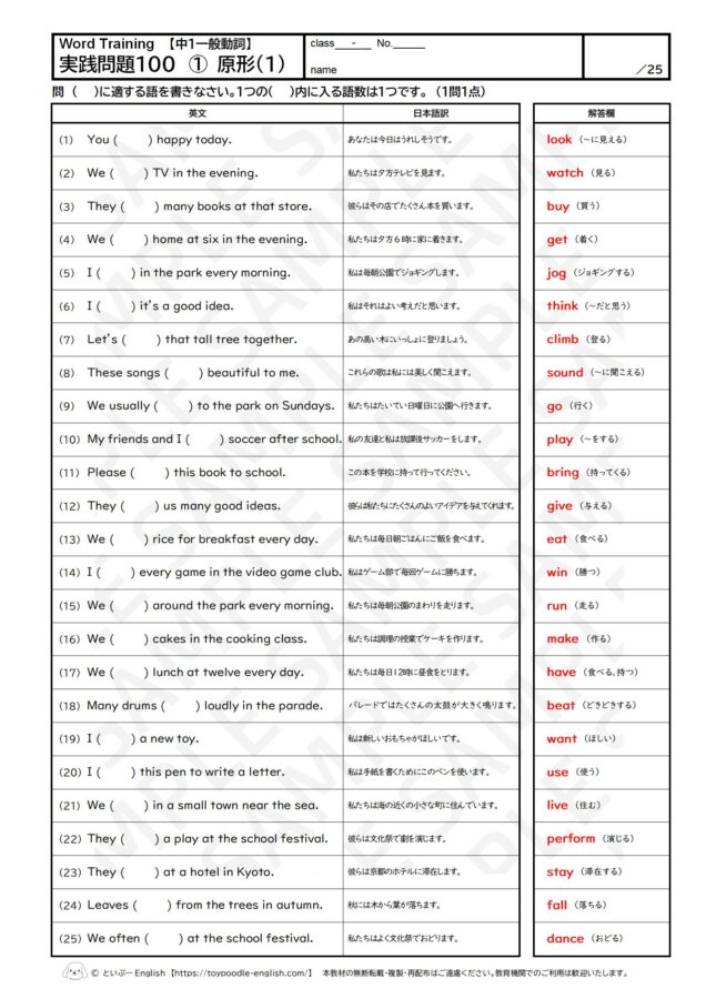 このあと紹介するプリントでは、100の動詞の「原形」だけでなく、「三単現」「-ing形」「過去形」「過去分詞形」も練習できます。