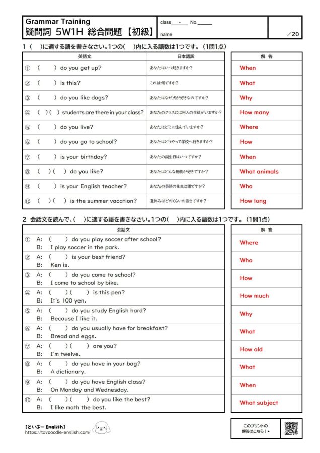 - ⑨ ( ) is your English teacher? 【訳】あなたの英語の先生は誰ですか?