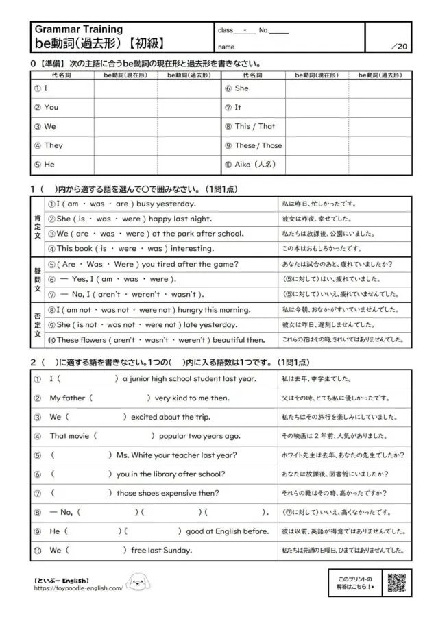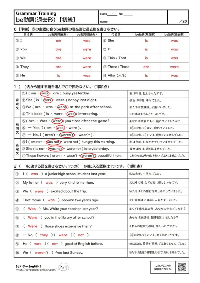 0 【準備】次の主語に合う be動詞の現在形と過去形を書きなさい。