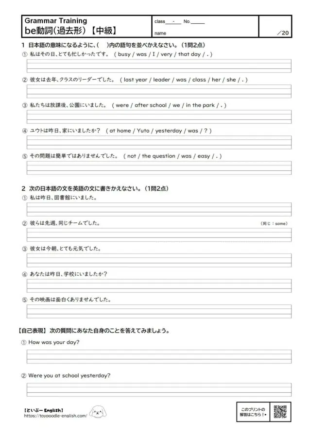 - ⑤ ( ) Ms. White your teacher last year? 【訳】ホワイト先生は去年、あなたの先生でしたか?