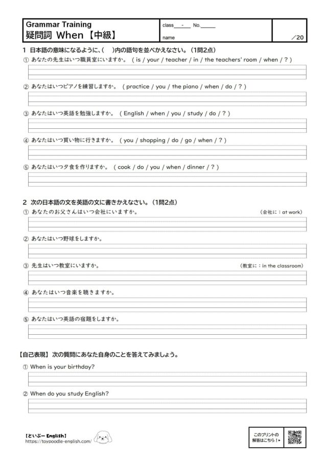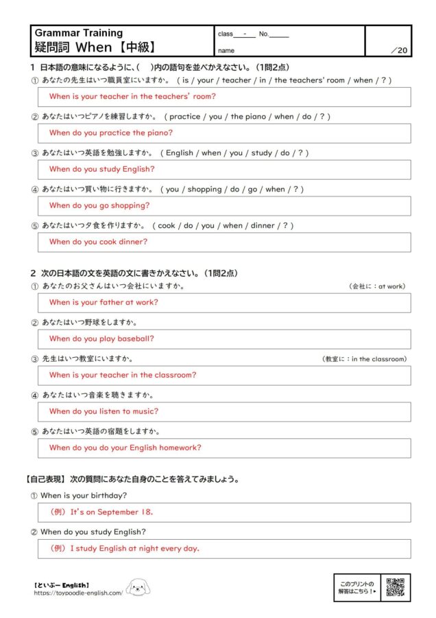 - ② あなたはいつピアノを練習しますか。 ( practice / you / the piano / when / do / ? )