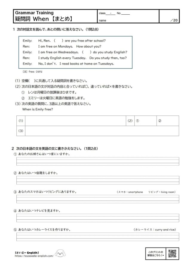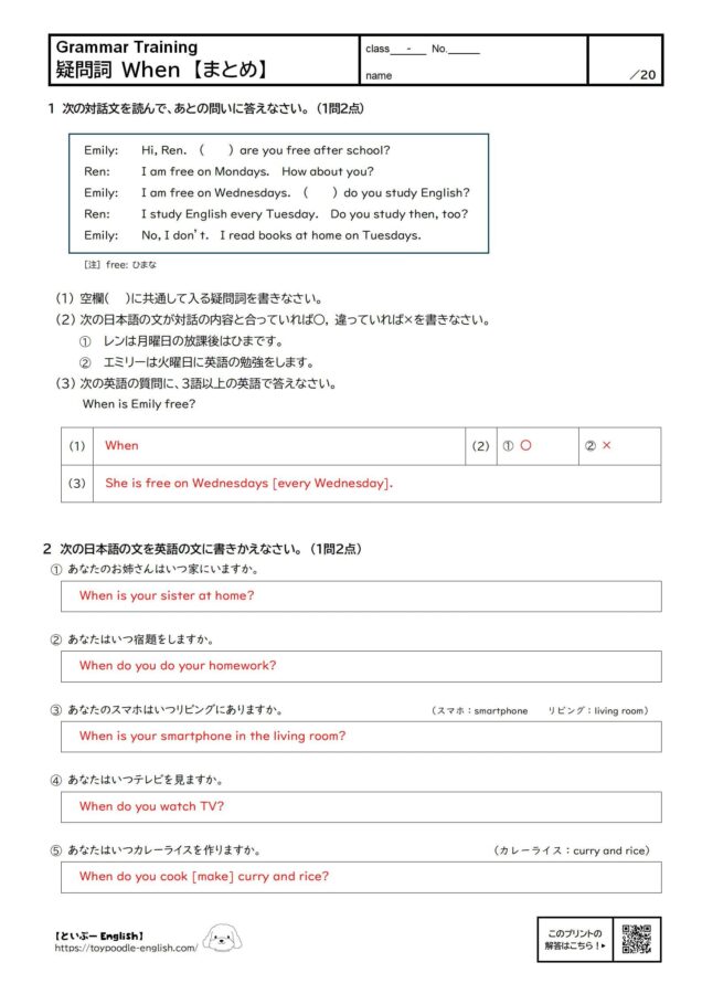 会話では「放課後のひまな時間」や「英語を勉強する日」を聞いているので、When がぴったりです。