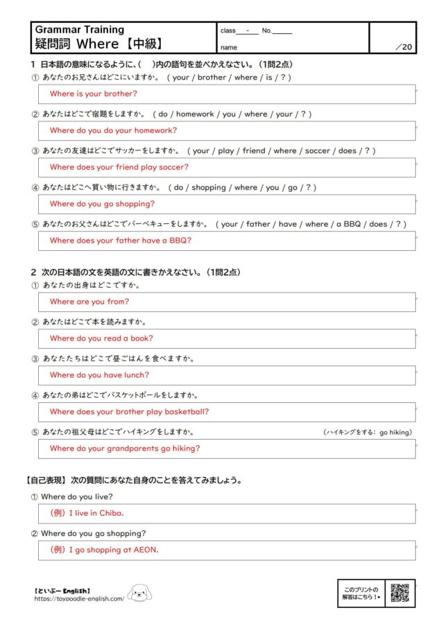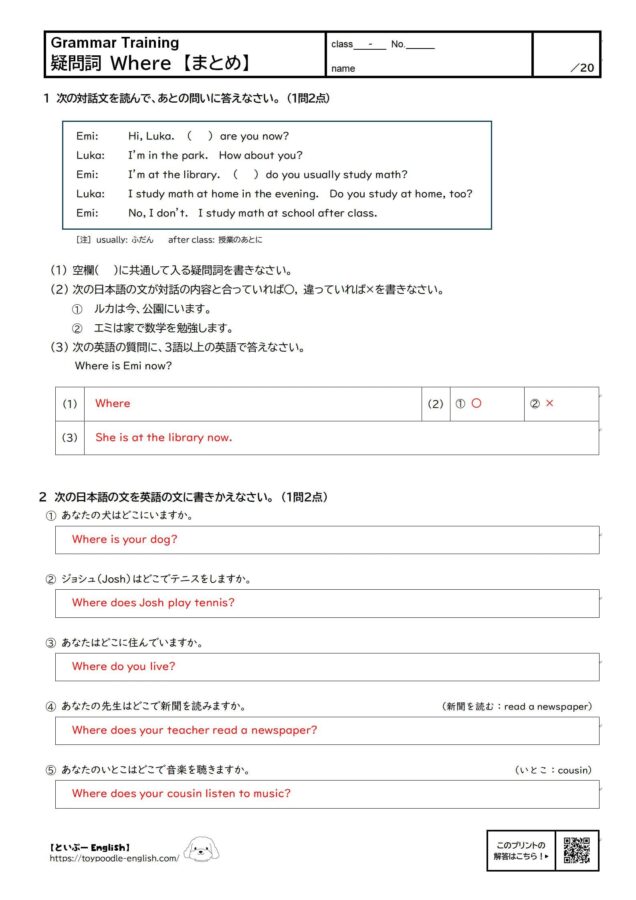 - ③ あなたの友達はどこでサッカーをしますか。 ( your / play / friend / where / soccer / does / ? )