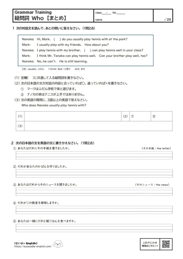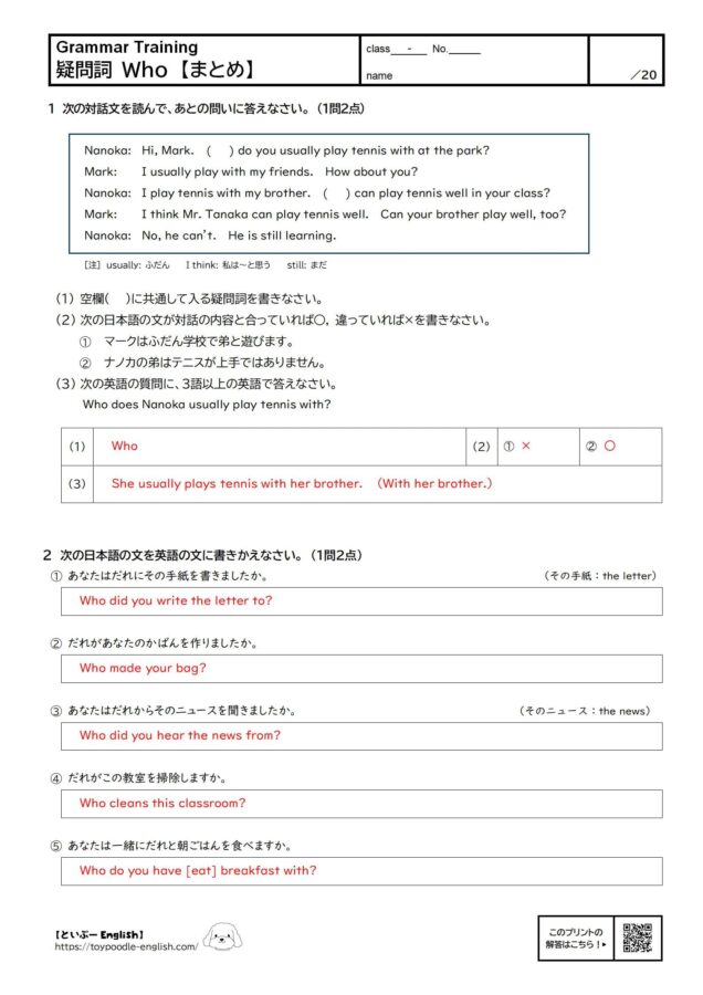 「Who do you play tennis with?」は「だれとテニスをしますか」という意味。