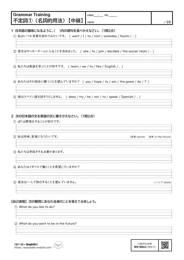 - ⑥ Do you ( want to be ・ are to want ) a teacher? 【訳】あなたは先生になりたいのですか?